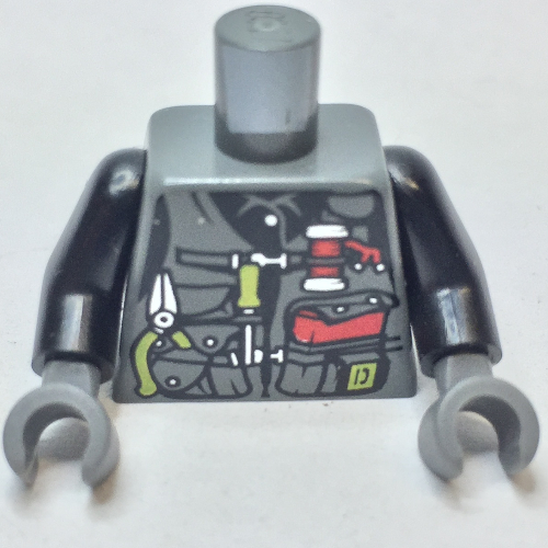 - Nom : Torso Dino Vest with Lime Handle Tools and Red Pocket Book Print / Black Arms / Dark Bluish Gray Hands