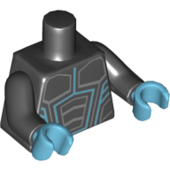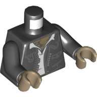 - Nom : Minifig Torso Dual Sides Body Armor with Black and Gold Belt - Large Bat Logo on Front (Batman) - Dark Bluish Gray Arms - Black Hands