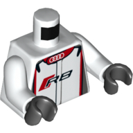 - Nom : Minifig Torso Race Suit with Audi Logo - 'Audi Sport e-tron quattro' on Front and Audi Logo on Back print / White Arms / Black Hands