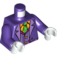 - Nom : Minifig Torso - Suit with Notched Lapels - Striped Vest over Orange Shirt and Green Tie print (Joker) - Dark Purple Arms - White Hands