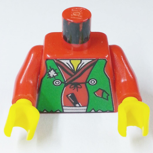 - Nom : Torso Castle Ninja Vest Green Tattered Print (Robber) - LEGO Logo on Back / Red Arms / Yellow Hands