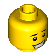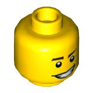 - Nom : Minifig Head Black Eyebrows, Raised Left Eyebrow, White Pupils, Crooked Open Smile with Teeth Print [Hollow Stud]