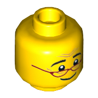 - Nom : Minifig Head Female with Hollow Stud - Large Round Glasses with Bright Light Blue Lenses and Black Frames - Closed Mouth with Orange Lips - Slight Crooked Smile Print