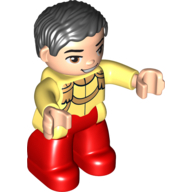 - Nom : Duplo Figure Male with Parted Wavy Hair - Red Shirt with Paw Print Badge and Bright Green Sleeves - Medium Dark Flesh Face - Tan Legs