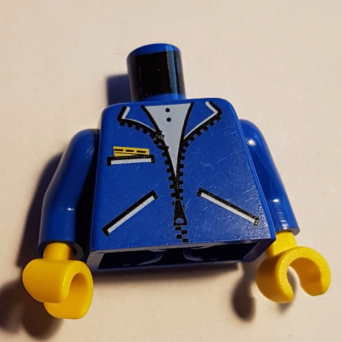 - Nom : Minifig Torso Police Jacket with Pocket and Gold Badge - Blue Tie Print / Black Arms / Yellow Hands