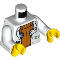 - Nom : Torso Lab Coat with Pockets and ID Badge over Orange Sweater, Arctic Explorer Logo on Reverse Print / White Arms / Yellow Hands