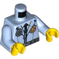 - Nom : Minifig Torso Police Shirt with Dark Bluish Gray Vest, Gold Badge, Radio and 'POLICE' print on Back / Bright Light Blue Arms / Dark Bluish Gray Hands