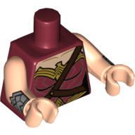- Nom : Torso Female Costume (Wonder Woman) with Crossbelt and Gold Neckline Trim - Silver Wrist Gauntlet Print - Light Flesh Arms - Light Flesh Hands