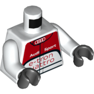 - Nom : Minifig Torso Race Suit with Audi Logo - 'Audi Sport e-tron quattro' on Front and Audi Logo on Back print / White Arms / Black Hands