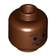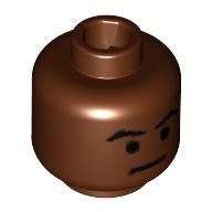 - Nom : Minifig Head Male Brown Eyebrows, Black Eyes with White Pupils, Crooked Smile with Black Dimple Print [Blocked Open Stud]