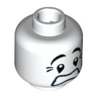 - Nom : Minifig Head Vertical Cheek Lines, Slight Frown, Chin Dimple and White Pupils Print [Blocked Open Stud]