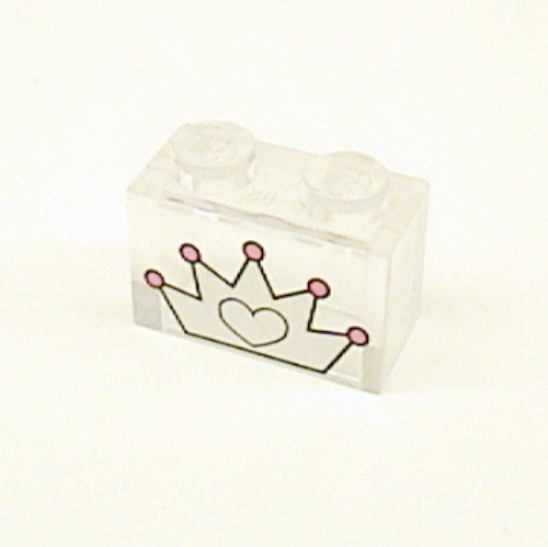 - Nom : Brick 1 x 2 without Bottom Stud with White/Dark Pink 5-point Crown Print