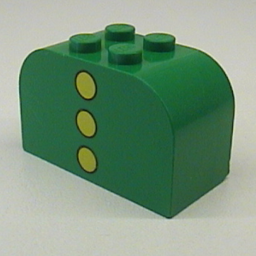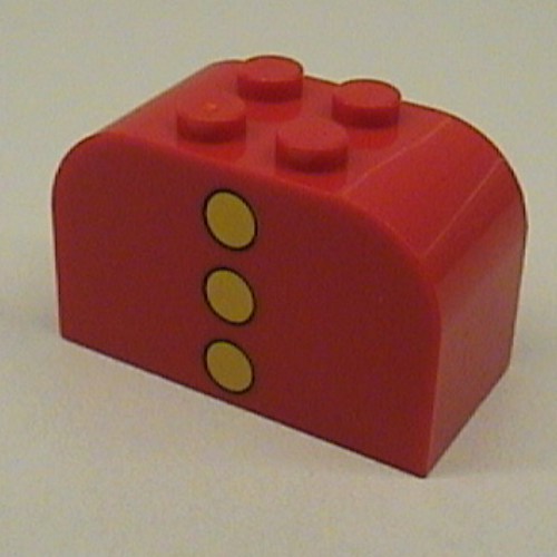 - Nom : Brick Curved 2 x 4 x 2 Double Curved Top with 3 Yellow Dots Print