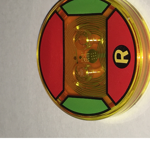 - Nom : Dimensions Stand - Toy Tag 4 x 4 x 2/3 with 2 Studs - Robin #72 with Yellow 'R' Logo on Red Background Print