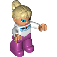- Nom : Duplo Figure Female Adult with Tan Ponytail, Blue Eyes, White Top with Blue Trim Design and Magenta Legs
