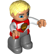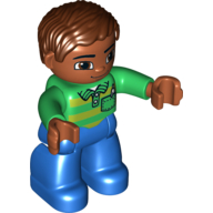- Nom : Duplo Figure Male with Parted Wavy Hair - Red Shirt with Paw Print Badge and Bright Green Sleeves - Medium Dark Flesh Face - Tan Legs